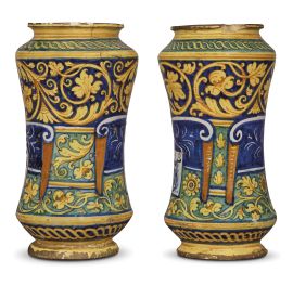 in maiolica dipinta in blu di cobalto, giallo arancio, giallo antimonio e bruno di manganese; entrambi gli albarelli recano tracce di etichette sul fondo; a) alt. cm 26,3, diam. bocca cm 10,8, diam. base cm 10,5; b) alt. cm 26, diam. bocca 10,5, diam. base cm 10