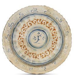 Il grande bacile da acquereccia, probabilmente in origine associato a un versatoio, appartiene alla produzione cosiddetta da “pompa”, che vede nella produzione di Montelupo alcuni importanti esempi e confronti, spesso associati a l’emblema di famiglie nobiliari e motivo decorativo a raffaellesche, a partire da esemplari databili con certezza ancora al XVI secolo e altri già del XVII secolo, come i bacili conservati al Museo di New York e al Bargello di Firenze, datati 1617 e 1626. Il nostro figurava tra i sei noti elencati da Fausto Berti nel 1998, già pubblicato da Conti come “esemplare toscano tardo cinquecentesco”. Pur essendo prossima per morfologia a un bacile con decoro floreale con emblema Medici-Austria di collezione privata datato 1628, tuttavia a livello stilistico e iconografico l’opera in esame mostra una cura particolare nella realizzazione delle raffaellesche che fa propendere per una produzione di poco anteriore.