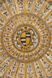 Il grande bacile con centro umbonato ha forma baccellata nell’umbone, nell’ampia fascia di stacco e nella breve tesa. Il bacile è apodo. Il decoro policromo interessa l’intera superficie e mostra al centro del cavetto l’emblema della famiglia Visdomini (inquartato, al canton destro campo d’oro, al canton sinistro fasce bianche e nere, in basso all’inverso al canton destro della punta fasce bianche e nere e al canton sinistro campo d’oro) in uno scudo ovale incorniciato da una mossa cornice a cartouche. Intorno all’umbone, disposti a raggera, una serie di sottili e complessi elementi “a candelabro” accompagnati, negli spazi triangolari tra una baccellatura e l’altra, da piccole testine di arpia. Un cordolo a rilievo separa l’umbone da una seconda sezione del cavetto, pure baccellata e interamente decorata da elementi di grottesche che vedono susseguirsi senza soluzione di continuità arpie, fauni alati, elementi ferini sostenuti da gioielli, cartouche, cammei e elementi velari. Sulla tesa i medesimi elementi sono ripetuti in versione singola. Sul verso, ove si leggono elementi decorativi a serpentina e girali fogliate delineate in blu acquarellato, al centro di una riserva circolare sottolineata da linee concentriche e da una ghirlanda delineata in rosso–arancio spicca la marca della bottega: Fo sopra omega.