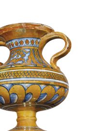 Il vaso ha corpo ovoidale appiattito, poggiante su un alto piede a base svasata, dotato di una bocca larga a bordo rifinito a stecca. Appena sotto l’orlo due anse a cordolo scendono arcuate per ricongiungersi al corpo nel punto di massima espansione. Il decoro prevede sotto il bordo, largamente orlato di lustro, una fascia riempita con infiorescenze ovali, cui fa seguito nella parte mediana del corpo un decoro a metope, suddivise da fasce verticali a puntinatura e a ghirlanda, contenenti un grande elemento fitomorfo. Il calice del vaso reca una decorazione a “baccellature oblique”. Tale ornato è realizzato in blu di cobalto su smalto stannifero con decori a lustro giallo dorato nelle porzioni lasciate riservate, completato sul piede con fasce parallele con un decoro a archetti.