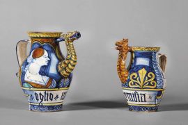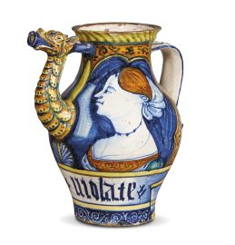 La brocca per sciroppo fa parte del noto gruppo Orsini-Colonna, insieme che comprende contenitori apotecari di varie tipologie, molto studiato soprattutto dopo i ritrovamenti archeologici a Castelli che negli anni ottanta hanno permesso di attribuire tale gruppo alla bottega di Orazio Pompei (1516 – 1590/1596), riconducendone la paternità all’Abruzzo. La bottega probabilmente produsse nel corso degli anni diverse serie di maioliche per altrettanti committenti, ma la vicinanza del ritratto, la morfologia e il decoro del nostro vaso lo fanno ritenere ancora legato al primo o al secondo gruppo di produzione, e quindi riferibile al secondo terzo del XVI secolo.