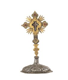 base ovale in argento sbalzato a volute rocaille, fusto in metallo dorato su cui poggia la Croce con bracci dai finali polilobati. Sul fronte figura del Crocefisso, sul retro una croce in cristallo con bollo in cerallacca sottostante. La base è chiusa da un pannello per contenere due documenti datati 1765 e 1766 che attestano la donazione della reliquia, alt. cm 32,5