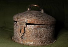 Round copper box with lid, inside engravings with plant motiv, North Africa
