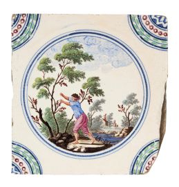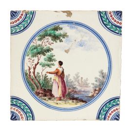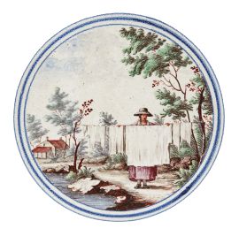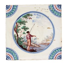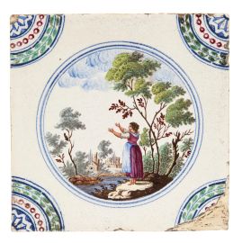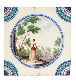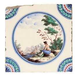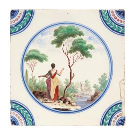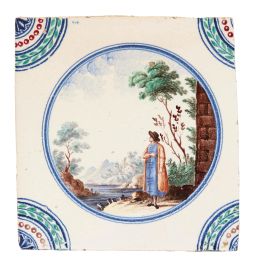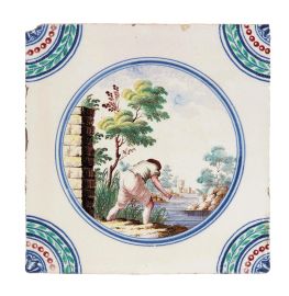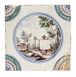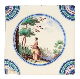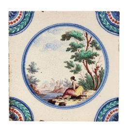 in porcellana di forma quadrata. Il decoro, realizzato in piena policromia, riproduce al centro scenette paesaggistiche con personaggi racchiusi in una riserva circolare orlata di blu, mentre gli angoli sono ornati con quarti di cerchio con decoro concentrico a corona fogliata, perlinatura e fioretto. I personaggi e i paesaggi sono vari tra loro, dipinti con la qualità e lo stile riservato ai servizi con decoro simile, denominato in manifattura “a paesini” o “a paesini con figure”, come riportato nei volumi conservati nell’archivio del Museo Richard-Ginori della Manifattura di Doccia, decoro affermatosi in manifattura intorno all’ultimo quarto del secolo XVIII. Le scene agresti rappresentate, “di maniera” e ripetitive, si ricollegano alle numerose decorazioni pittoriche di ispirazione veneta, in particolare a quelle di Giuseppe Zais (1709-1781). Quattro mattonelle di questa produzione sono conservate al Mic di Faenza, provenienti dalla Collezione Cora; cm 15x15 circa ciascuna