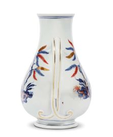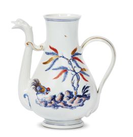 in porcellana dipinta in policromia e oro; corpo piriforme con piede rastremato e modanato, ansa alta e mossa, il beccuccio termina a forma di testa di serpe ed è collegato al corpo da una staffa. La caffettiera, priva di coperchio, mostra un decoro “a galli blu, rossi e oro”, una variante piuttosto rara di un ornato molto amato e richiesto. Il decoro, prevalentemente in blu, si basa sul caratteristico motivo con albero a salice piangente poggiante su rocce, in questo caso d’ispirazione occidentale, e la figura di un gallo con cresta e ali rosse; il rosso è utilizzato con parsimonia, anche per dipingere alcune delle lunghe foglie dell’albero; alt. cm 18,8, largh. massima cm 17,7, diam. cm 11,8
