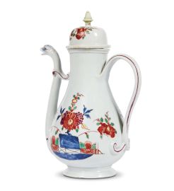 in porcellana dipinta in policromia, corpo piriforme allungato su alto piede modanato, beccuccio a testa di serpe collegato al corpo mediante staffa, coperchio a cupola con pomolo a bottone. La caffettiera è decorata con un motivo Kakiemon denominato "a tavolino", di chiara derivazione orientale, ma giunto alla manifattura toscana attraverso la mediazione della porcellana di Meissen, dove era noto come Tischen Muster; alt. cm 24,5, largh. massima cm 16,8, diam. cm 11,8