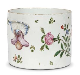 in porcellana dipinta in policromia, corpo cilindrico con manici applicati a forma di valva di conchiglia. Il decoro prevede rari fiori d’ispirazione naturalistica raccolti in un mazzetto, avvicinabili all’ornato classificato “a ciocchette primitive”, in una versione meno ordinata rispetto al vaso presentato al lotto precedente, ma più articolata; alt. cm 14, diam. bocca cm 17,4, diam. piede cm 17