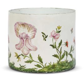 in porcellana dipinta in policromia, corpo cilindrico con manici applicati a forma di valva di conchiglia. Il decoro prevede rari fiori d’ispirazione naturalistica che in questo esemplare poggiano su una larga isola erbosa, il tutto trattato con grande attenzione pittorica. Il decoro qui presente sembra riferibile a quelli cosiddetti “a ciocchette primitive”, ma in una versione più vicina a certe soluzioni ispirate dalla porcellana europea contemporanea; alt. cm 14, diam. bocca cm 17,1, diam. piede cm 17