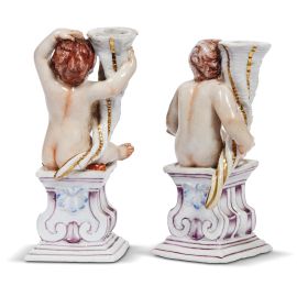in porcellana dipinta in policromia, costituiti da due piccole sculture di putti che sorreggono una cornucopia nella quale è ricavato un vano portacandela. I due, putti uno in una posa plastica con braccio alzato e gambine parzialmente coperte da un drappo rosso e l’altro ignudo appoggiato alla cornucopia, sono montati su basette quadrangolari di forma architettonica. La presenza negli inventari di “Putti col Cornucopio” o di “puttini piccoli e grandi” colloca queste piccole sculture nella produzione tra il 1760 e il 1780; alt. cm 12 e cm 12,8