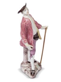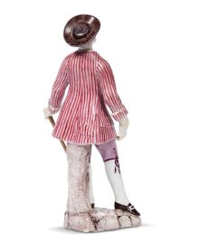 in porcellana dipinta in policromia raffigurante una figura maschile con cappello a larghe falde, giacchetta a righe, camicia senza collo e pantaloncini al ginocchio, alla vita un sacchetto e nella mano destra un bastone. La piccola plastica, come le precedenti, trova riscontro nella produzione della seconda metà del secolo ispirata agli ideali arcadici; alt. cm 14,5