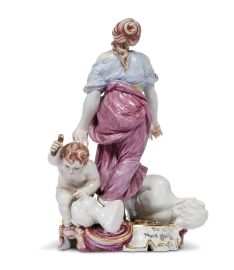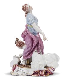 in porcellana dipinta in policromia, raffigurante l’Allegoria della Scultura: una figura femminile in atteggiamento ispirato, mentre ai suoi piedi un fanciullo scolpisce un busto e un torso; in un cartiglio posto alla base l’iscrizione “Per te Nova gloria Caelo”. La piccola plastica trae origine da un modello ideato dallo scultore Gaspero Bruschi, elencato nell’Inventario dei Modelli come presente nel “Secondo Palchetto della Sesta Stanza”, da cui deriva una versione simile alla nostra, ma con alcune varianti, oggi conservata al Museo Stibbert di Firenze; cm 19,7x14,4x12,8