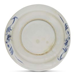 in porcellana decorata in monocromia azzurra; di forma circolare, presenta cavetto poco profondo e tesa obliqua e breve. La tesa è ornata da un decoro vegetale d’ispirazione orientale, mentre al centro del cavetto si legge una figura femminile che si asciuga dopo il bagno, ispirata alle Veneri classiche: seduta su una roccia a gradoni in un paesaggio con un alberello piegato dal vento; diam. cm 22,6, alt. cm 3,1