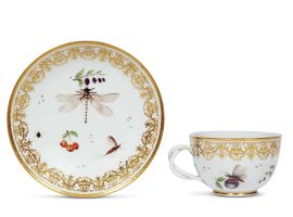 in porcellana, la tazzina ha forma a coppetta con ansa intrecciata, il piattino è circolare con tesa rilevata; le superfici sono interessate da un’importante decorazione costituita da piccoli insetti e fruttini sparsi lungo la superficie, mentre l’orlo è decorato con un motivo a pizzo in oro. Il decoro a insetti, di gusto naturalistico, trae ispirazione dagli ornati utilizzati a Meissen tra gli anni trenta e quaranta del Settecento, e a Doccia viene utilizzato su fondi marrone, alla cappuccina e bianco; tazzina alt. cm 4,9, piattino diam. cm 12,6