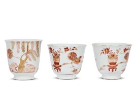 in porcellana dipinta in monocromia e oro, a forma di campana, prive di ansa. La superficie mostra il decoro “al galletto rosso”, ornato che in manifattura Ginori viene indicato in una “Tariffa delle Porcellane dipinte” e sembra risalire al 1747, spesso eseguito fin dai primi anni di produzione con varianti cromatiche in verde, blu, rosso, arancione, con o senza tocchi d’oro. Queste tre tazzine rappresentano un esempio di come la morfologia della tazza e del decoro mutassero all’interno della manifattura; alt. cm 6,2 (2) e cm 7,1 (1)