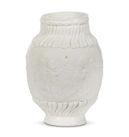 in porcellana bianca, corpo di forma ovoidale su alto piede decorato a “bassorilievo istoriato”. Si tratta di una tipologia rara, ma ben nota agli studi, caratterizzata dalla fascia centrale con un corteo di putti dall'antico; l’ornato è completato da due fasce a rilievo baccellate sulla spalla e al calice e da una fascia a ghirlanda lungo l’orlo. La materia è abbastanza sottile e si è piegata in lavorazione. Il corteo di putti mostra un gruppo con elementi legati alla caccia e un secondo con loriche e strumenti di guerra. L’opera, riferibile al primo periodo della manifattura, si colloca nella miglior produzione del periodo, unitamente a un confronto puntale recentemente transitato sul mercato, ora in collezione privata; alt. cm 22, diam. cm 15,4
