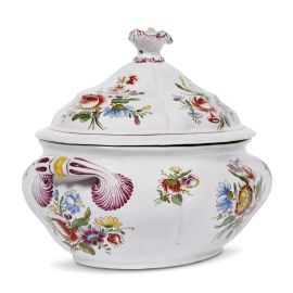 in porcellana dipinta in policromia, corpo ovoidale sagomato e costolato, anse mosse ed estroflesse, coperchio anch’esso mosso e costolato sormontato da presa a fiore. Il decoro policromo, conosciuto come “a mazzetto”, è disposto simmetricamente sul corpo e sul coperchio con mazzi di fiori e fioretti sparsi, dipinti con grande cura e impreziositi da tocchi di oro; cm 19,5x27,5x19,8