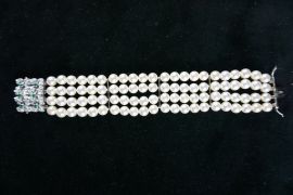 Composto da quattro fili di perle di mm 7 circa, distanziali e fermatura in oro bianco 18kt impreziosita da diamanti taglio huit huit per ct 0.80 circa e smeraldi taglio rotondo per ct 0.30 circa, lungh. cm 19, gr. 61. Corredato di scatola.