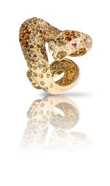 In 18kt yellow gold, made in the shape of a snake, embellished with round cut citrine quartz and two small rubies, signed “Pasquale Bruni” and “Il Peccato”, mis. 52, gr. 29. Comes with box.