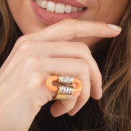 in oro giallo e bianco 18kt, al centro due cilindri impreziositi da diamanti taglio brillante per ct 1.30 circa, volti a trattenere due semicerchi in corallo, punzoni 750 e 18kt, mis. 49, gr. 18