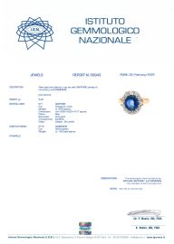 in oro rosa 18kt e platino, al centro uno zaffiro taglio ovale di ct 4 circa, circondato da diamanti taglio vecchio per ct 1.60 circa, mis. 59, gr. 5. Corredato di certificato IGN del 02/02/2022 attestante l'origine della pietra e l'assenza di trattamenti termici.