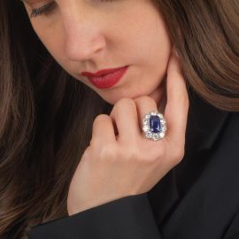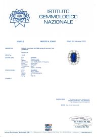 in platino, al centro uno zaffiro ceylon taglio cuscino di ct 8.20 circa, circondato da una fila di diamanti taglio brillante per ct 5 circa, mis. 56, gr. 10. Corredato di certificato IGN del 2/02/2022 attestante l'origine geografica e l'assenza di trattamenti termici.