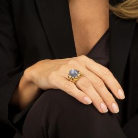 in oro giallo 18kt cesellato, al centro uno zaffiro asteria taglio cabochon di ct 26 circa, circodato da diamanti taglio brillante per ct 0.40 circa, punzone 750, mis. 49, gr. 20
