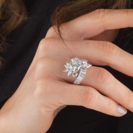 in platino, impreziosito al centro da un diamante taglio brillante di ct 2.30 circa, circondato da diamanti taglio misto per ct 3.40 circa, mis. 51, gr. 11