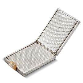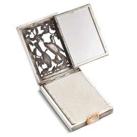 in argento e oro, di forma rettangolare, dalla superficie incisa con motivo scanalato e a riquadri, parte centrale del coperchio traforata e raffigurante due uccellini su rami impreziositi da rubini taglio rotondo, corredato di specchio interno, firmata "Boucheron Paris", punzoni francesi argento e oro, numero seriale, dim. cm 5,5x7,5, gr. 177 complessivi