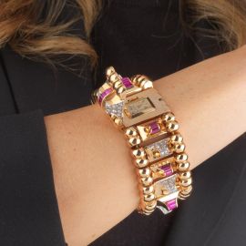 cassa in oro rosa 18kt, quadrante firmato "Universal Geneve", indici applicati, movimento a carica manuale, bracciale ad ampio binario in oro rosa 18kt e platino, composto da una serie di elementi acuminati impreziositi da rubini taglio baguette per ct 6 circa e da diamanti taglio huit huit per ct 4.80 circa, punzoni 18kt e "Platine", lungh. cm 18,5, gr. 156