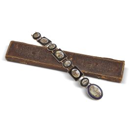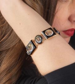 in oro a basso titolo, composto da una serie di elementi di forma ovale e rettangolare recanti al centro micromosaici raffiguranti monumenti classici su base in calcedonio nero e blu, dim. cm 2x17,5, gr. 27