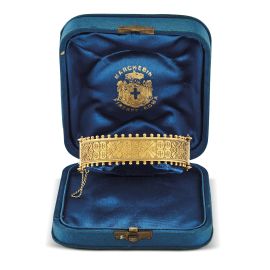 in oro giallo 18kt, decorato a fregio continuo con lavorazione a microgranulazione, dim. cm 6,5x5,5, diam. interno cm 5,5, gr. 24