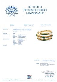 in oro giallo 18kt, a tre fasce di smeraldi fra cui tre centrali colombiani taglio ottagonale per ct 5.50 circa, con perle naturali barocche di mm 7.5/8 circa e diamanti taglio vecchio per ct 3.80 circa, dim. cm 7x6,5, diam. interno cm 6, gr. 82. Corredato di certificato IGN del 17/03/2022 attestante le caratteristiche e l'origine dei tre smeraldi centrali.