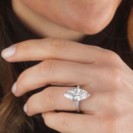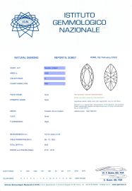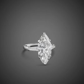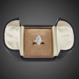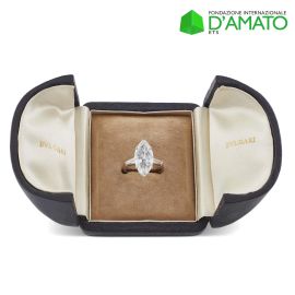 in platino, con al centro un diamante taglio navette di ct 4.99, colore D, purezza VS2, affiancato da due diamanti taglio tapes per ct 0.50 circa, firmato "Bulgari", mis. 52, gr. 5. Corredato di scatola e certificato IGN del 09/02/2022 attestante le caratteristiche.