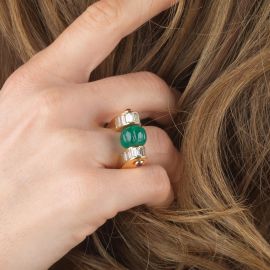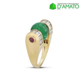 in oro giallo 18kt, composto al centro da una sfera mobile di smeraldo taglio a meloncino di mm 8x10 circa, affiancata da una fila di diamanti taglio baguette per ct 5.60 circa e ai lati da due rubini taglio cabochon, firmato "Bulgari", punzoni 750 e del fabbricante, mis. 52, gr. 16