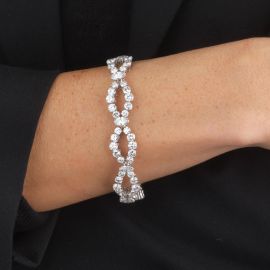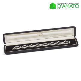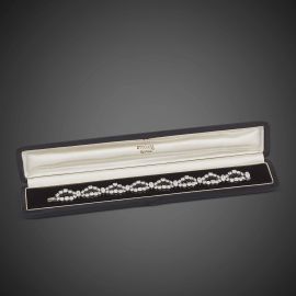 in oro bianco 18kt, composto da una doppia fila ondulata di diamanti taglio brillante per ct 10 circa, uniti da diamanti taglio navette per ct 2.50 circa volti a formare un elegante motivo a catena, firmato "Bulgari", lungh. cm 17,5, gr. 28. Corredato di scatola.