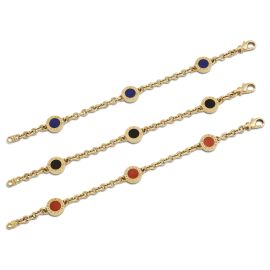 in oro giallo 18kt, composta da tre bracciali a maglia rollò con distanziali recanti al centro corallo, onice e lapislazzuli, firmata "Bulgari Bulgari", punzoni 750 e del fabbricante, chiusura a moschettone, lungh. cm 60, convertibile in tre bracciali lunghi cm 20, gr. 77