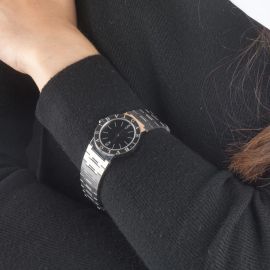 cassa in acciaio, fondello a pressione, lunetta in acciaio firmata Bulgari, quadrante nero, grafica bianca, indici e numeri arabi in bianco, movimento al quarzo, bracciale in acciaio a maglie, lungh. interna cm 19, chiusura deployant a scomparsa marcata Bulgari, vetro minerale. Diam. mm 30