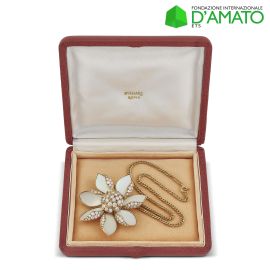 in oro giallo 18kt, catena a maglia groumette da cui pende una grande spilla a forma di fiore con petali in madreperla e impreziosita da diamanti taglio brillante per ct 5 circa, firmata "Bulgari Roma", punzoni francesi, punzoni 750 e del fabbricante, dim. spilla cm 6x6, lungh. collana cm 40, chiusura a moschettone, gr. 40 complessivi. Corredata di scatola.