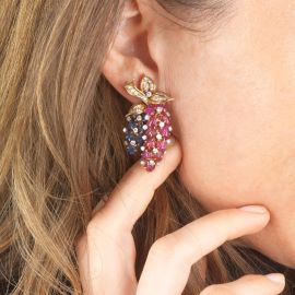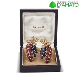 in oro giallo 18kt, a forma di tralci fioriti, impreziositi da zaffiri e rubini incisi e da diamanti taglio brillante per ct 1.10 circa, firmati "Bulgari", punzoni 750 e del fabbricante, dim. cm 2,5x4,5, chiusura a clip, gr. 27 complessivi. Corredati di scatola.