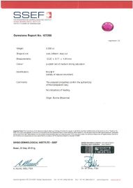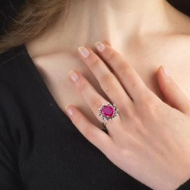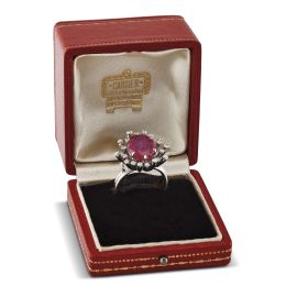 in oro bianco 18kt, al centro un rubino birmano "purplish red" taglio ovale di ct 5.59, circondato da diamanti taglio huit huit per ct 0.40 circa, firmato "Cartier Paris", punzone 750 e numero seriale, mis. 52, gr. 11. Con certificati SSEF e Gubelin attestanti l'origine della pietra e l'assenza di trattamenti termici. Corredato di scatola originale e certificato di riparazione della Maison Cartier di via Condotti 83 (Roma) a confermare l'originalità dell'anello in quanto "Creazione Cartier".