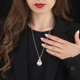 in oro bianco 18kt, con pendente composto da una perla south sea di mm 19, sormontata da un motivo a spilare impreziosito da diamanti taglio brillante per ct 0.30 circa, punzoni 750 e del fabbricante, dim. pendente cm 2x3, punzoni 750 e del fabbricante, chiusura a moschettone, lungh. cm 60, gr. 24
