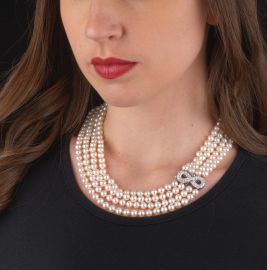 composta da quattro fili di perle di mm 6 circa, fermatura in oro bianco 18kt con simbolo dell'infinito impreziosita da diamanti taglio brillante e huit huit per ct 1.10 circa, lungh. cm 42,5, gr. 97