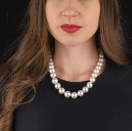 composta da una fila di perle leggermente digradanti di mm 14-10 circa, fermatura a moschettone in oro bianco 18kt, lungh. cm 46, gr. 96