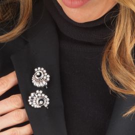 in oro bianco 18kt, disegnate seguendo un motivo a volute, impreziosite da diamanti taglio brillante per ct 2.70 circa, dim. cm 2,5x3, gr. 32 complessivi