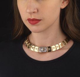 in oro giallo 18kt, composto da una serie di maglie di forma geometrica impreziosite da diamanti taglio brillante e triangolari per ct 6 circa, con al centro due diamanti taglio triangolare su sfondo in madreperla, firmato "Fasano", punzoni 750 e del fabbricante, dim. cm 13,5x14, diam. interno cm 11, gr. 150