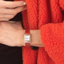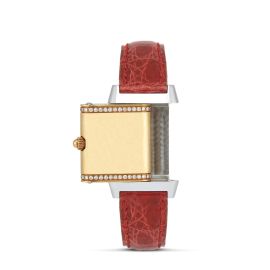 cassa di forma rettangolare in oro giallo 18kt con sistema a scorrimento e alloggio in acciaio, lunetta impreziosita da due file di piccoli diamanti, quadrante argenté firmato Jaeger LeCoultre, grafica di nera, numeri arabi stampati, movimento al quarzo, cinturino originale in pelle rossa, lungh. interna cm 17 circa, chiusura deployant in acciaio marcata Jaeger LeCoultre, vetro minerale, gr. 42. Dim. mm 20x28