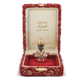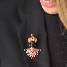 in oro giallo 18kt ed ebano, impreziosito da rubini taglio rotondo per ct 2.30 circa e da perle di mm 4 circa, una perla di mm 7 circa sopra il turbante, firmato "Nardi", punzoni 750 e del fabbricante, dim. cm 4x6, gr. 32. Corredato di scatola.