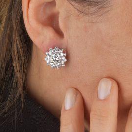in oro bianco 18kt, a forma di fiore, impreziositi da diamanti taglio brillante per ct 2.20 circa, con al centro un diamante taglio brillante di ct 1.76, colore J, purezza SI2 e un diamante taglio brillante di ct 1.65, colore I, purezza Vs2, dim. cm 1,5x1,5, chiusura a clip, gr. 10 complessivi. Corredati di certificati IGN del 9/02/2022 attestanti le caratteristiche.