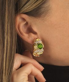 in oro giallo 18kt, impreziositi al centro da quarzi verdi e arancioni taglio rotondo per ct 5.70 circa, circondati da pavé di diamanti taglio brillante per ct 3 circa, punzoni 750 e del fabbricante, dim. cm 2,5x3, chiusura a clip con perno, gr. 33 complessivi