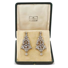 in oro bianco 18kt, a forma di tralci impreziositi da diamanti taglio vecchio, huit huit e a rosa per ct 4.60 circa, dim. cm 3x6,5, chiusura a vite, gr. 24 complessivi. Corredati di scatola firmata Petochi.
